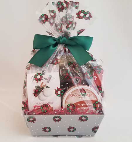 Sweet Gift all wrapped up in Christmas wreath cellophane. Includes Janis & Melanie Holiday Spice Cookie, Cherry Republic Dark and Milk Chocolate Turtles, Glacier Ridge Farms Smoked Gouda Wedges Wheel, Mille Lacs Original Beef Summer Sausage, Elki Sesame Water Crackers, Brown & Haley Almond Roca, Marich Dark Chocolate Espresso Beans, and Cherry Republic Cherry Nut Mix.