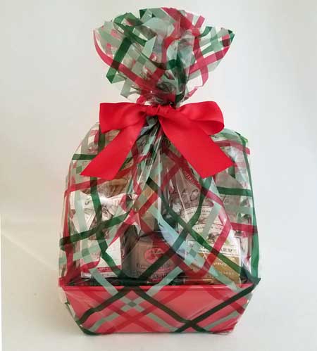 Sweet Holiday gift they will love. Includes Bequet Classic Caramels, Snacktales Coconut Toffee Cashews, East Shore Cranberry Mustard, East Shore Seasoned Pretzels, Cherry Republic Dark Chocolate Covered Pretzels, Two Packets of Nunes Farms Classic Almonds, Two Packets of Sorrento White Chocolate Artisan Hot Cocoa Mix, and Cherry Republic Ruby Red Sour Patches all wrapped up in Christmas cellophane.