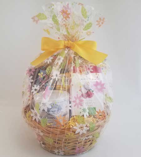 Adorable gift filled with delicious treats. Includes Cherry Republic Iced Imperial Pretzels, Bay Beyond Crab House Crunch – Old-fashioned peanut squares, sweet from the sugar, salty from the nuts, with the added fire of Chesapeake Bay Seasoning, Janis & Melanie Raspberry Tea Cookies, Cherry Republic Dark Chocolate Covered Cherries, Truffettes de France Truffles, Brown & Haley Almond Roca, Marich Dark Chocolate Sea Salt Cashews and Cherry Republic Dark and Milk Chocolate Turtles all set in a reusable wicker basket and wrapped in colorful flower cellophane.